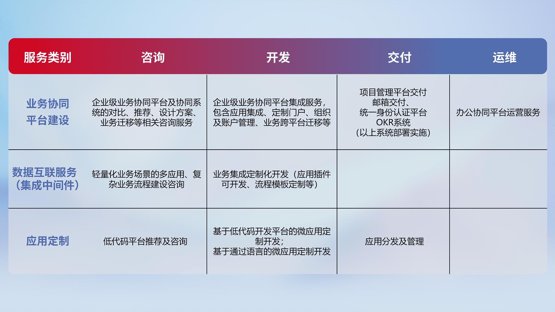 针对钉钉、、企微、、、、IDaas等平台级产品提供产品的规划、、、方案、、、交付、、定制化开发等服务,,,实现如统一协同办公、、智能客户服务、、、、混合会议管理、、、、智能数据查询、、、等业务场景,,,,实现数字化转型。。。。